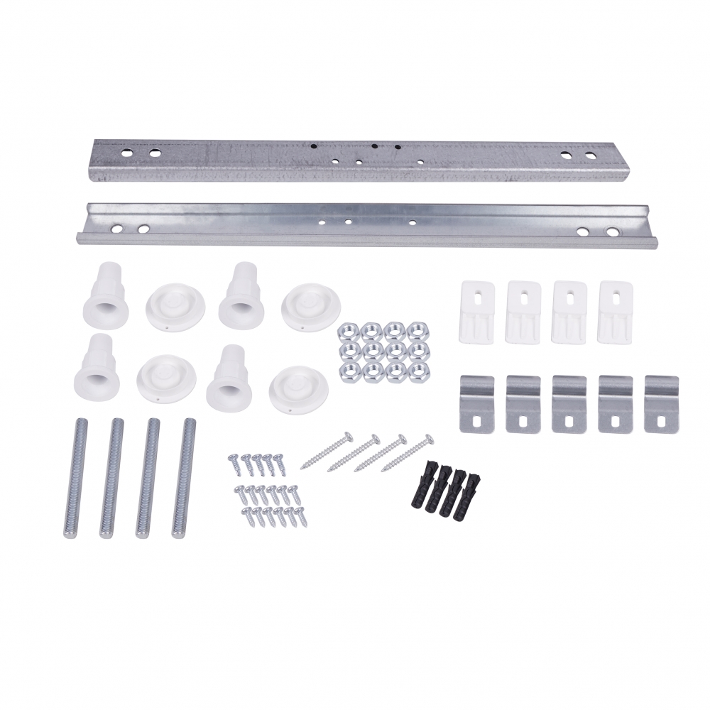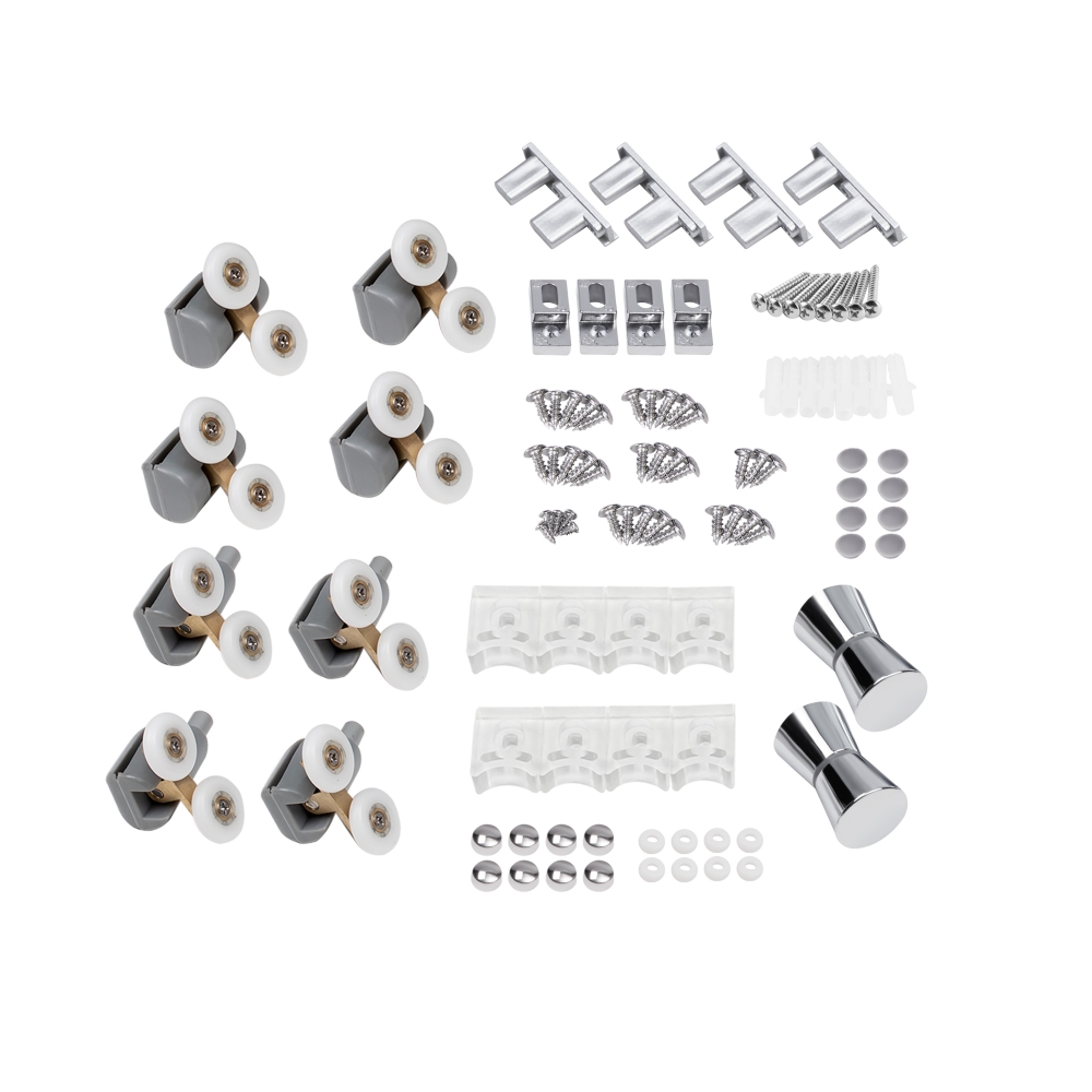 Профиль, двойные ролики, ручки, комплект крепежей, глухое стекло, стеклянные двери, душевой поддон, панель, ножка.
