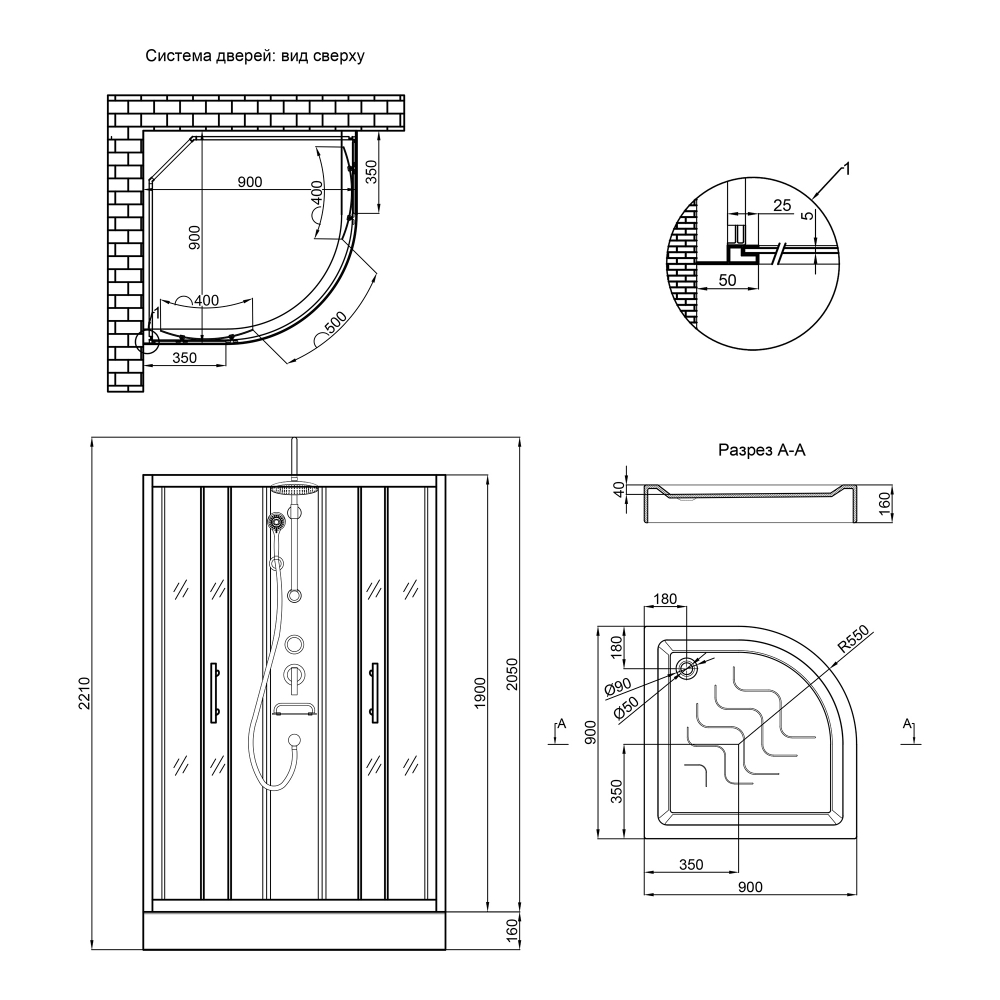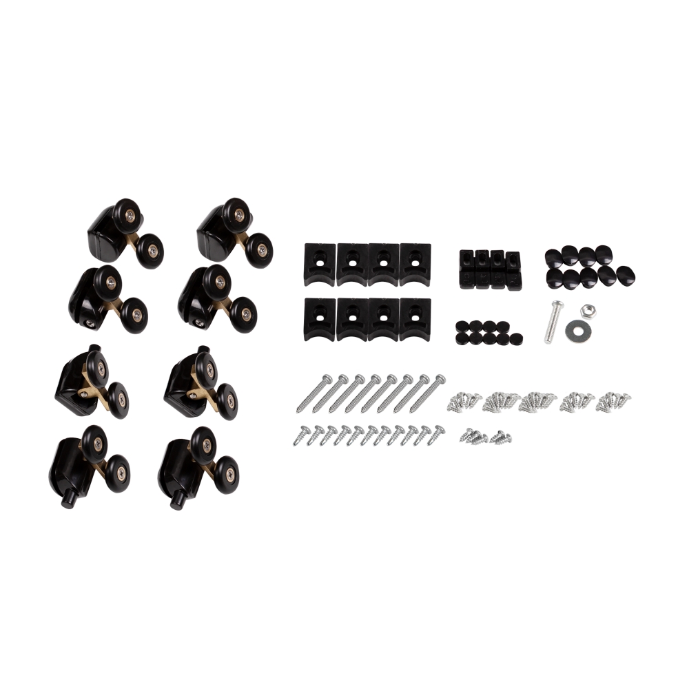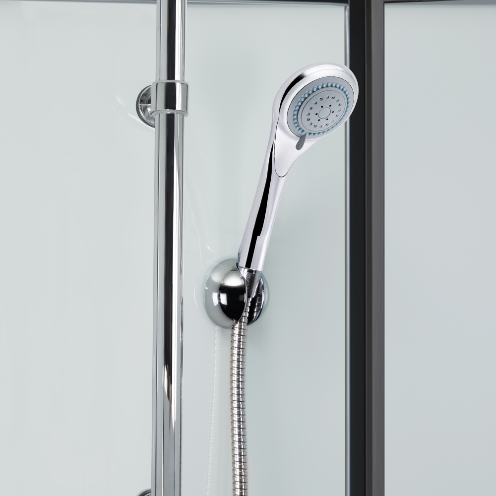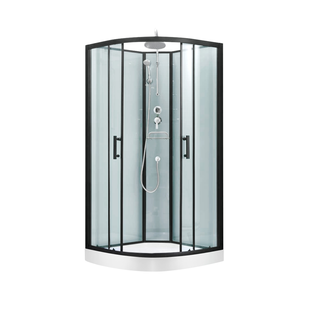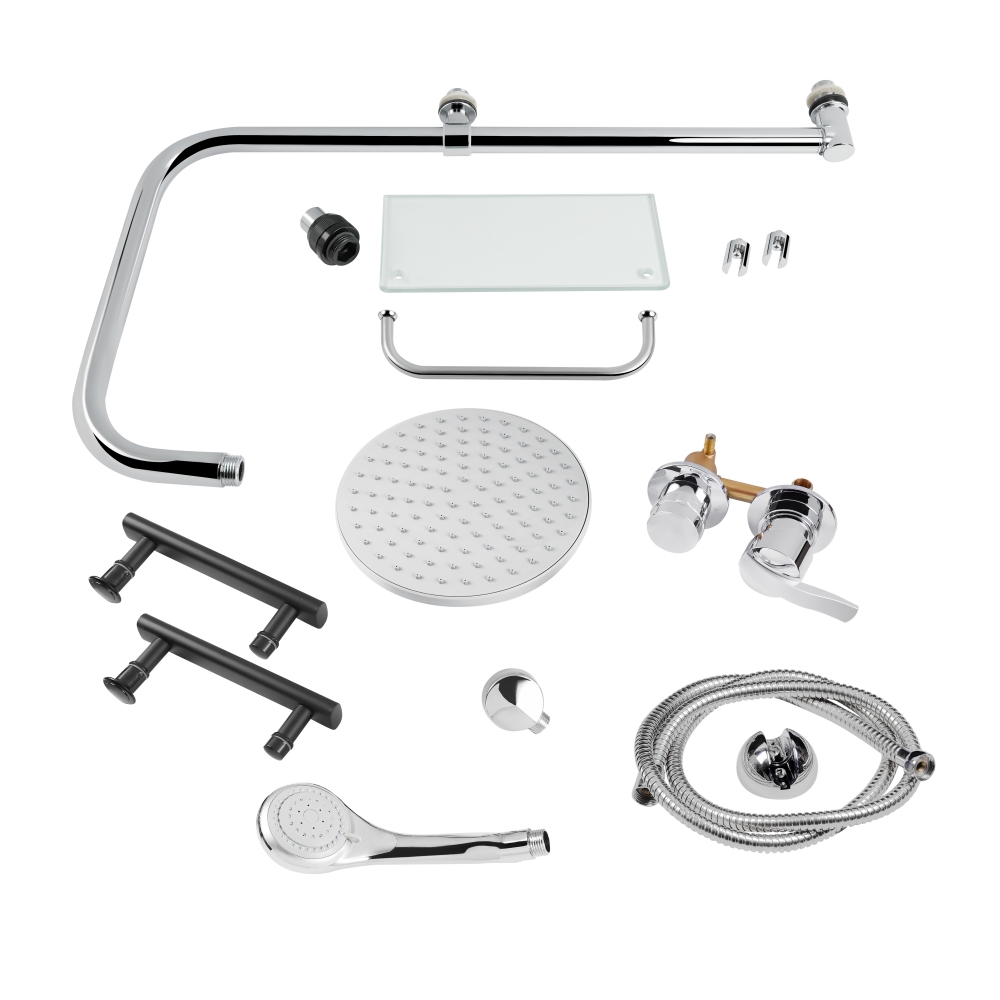 Поддон, двойные ролики, ручки, профиль, комплект крепежей, задняя стенка, глухое стекло, стеклянные двери, душевая панель, смеситель, лейка для ручного душа, лейка для верхнего душа, душевой шланг, кронштейн, верхняя крышка, стеклянная полка, панель для поддона, ножки.