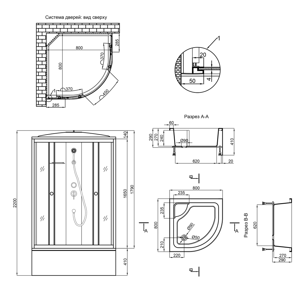 Душевой бокс: SB80x80.SAT.HIGH.FR. Поддон: ST80x80x41. Панель: TP80x80x38.