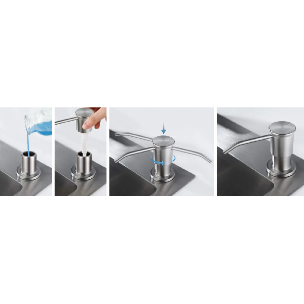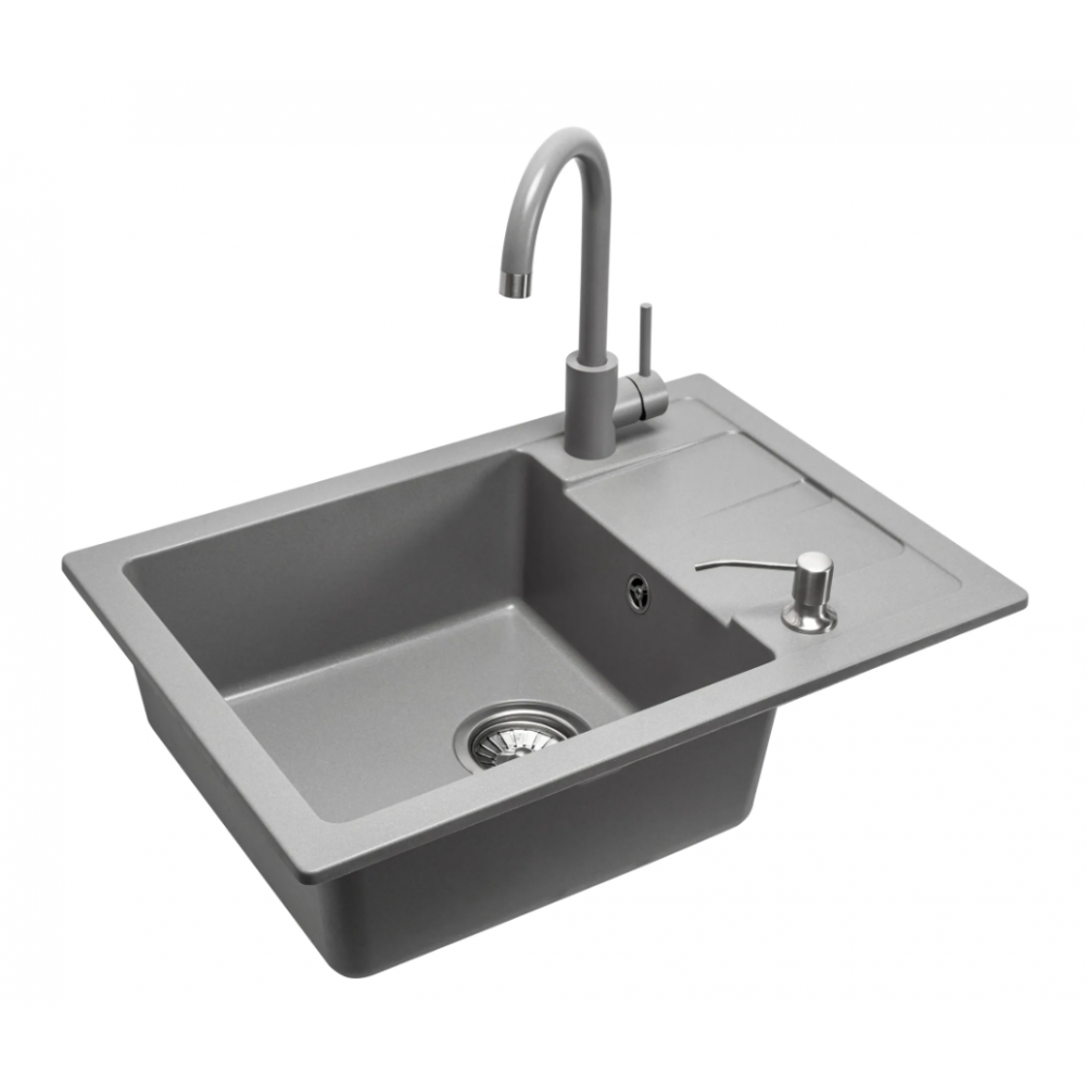 В комплект входит раковина из конгломерата на 1 чашу, смеситель с керамической головкой, дозатор моющих средств, ручной сифон и сливной комплект с возможностью подключения стиральной или посудомоечной машины.